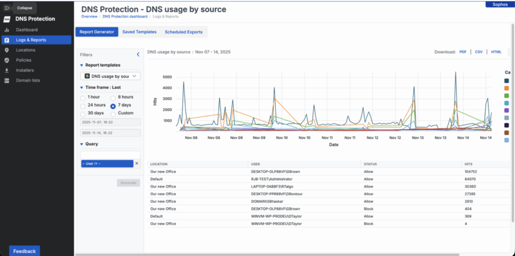 Every DNS request from endpoint devices is recorded along with the associated user and device names, which aids in troubleshooting and speeds up security response efforts. This detailed logging also enhances the quality of information available for XDR and MDR investigations.